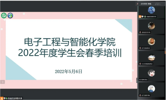 为深入贯彻党的十九届六中全会精神,结合庆祝建团100周年扎实开展中国青年运动史专题学习,巩固深化学生会组织改革成果,落实全面从严治会要求,规范组织建设机制,进一步增强学生会组织工作队伍整体素质,不断提高同学满意度,大局贡献度,社会认可度,树立起富有理想,关心同学,清新阳光的组织形象,电子工程与智能化学院学生会于2022年5月6日以线上会议的形式开展了2022年春季学生会工作人员培训会。