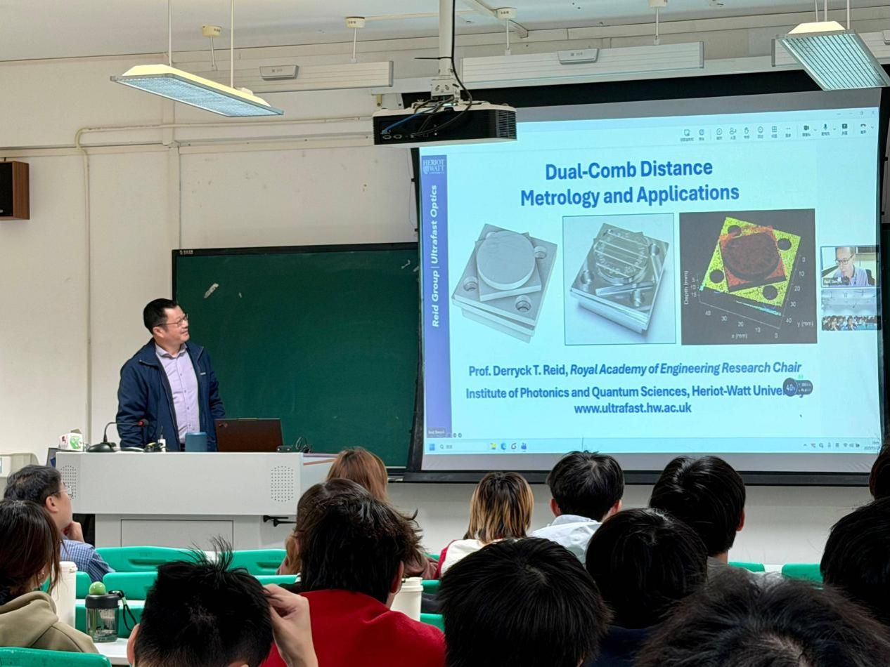2025年12月27日,作为永利集团国际学术周活动之一,孙敬华教授盛情邀请英国赫瑞-瓦特大学(Heriot-Watt University)的Derryck T. Reid教授作了题为“双光梳测距计量及其应用”(Dual-comb distance metrology and applications)的国际学术讲座。讲座吸引了学院和相关学科100余名本科生、研究生及科研人员的热情参与,现场学术氛围隆重而活跃。