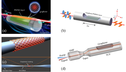 随着光纤器件的不断发展,以及制作光纤的工艺飞速进步,不同结构的特种光纤被研发用来实现更多的功能。常见的特种光纤包括:多芯光纤、无芯光纤、空芯光纤、保偏光纤、光子晶体光纤等。在光纤器件的制备中,为了增大对环境参量的灵敏度,通常还会使用物理和化学修饰的方法对光纤进行处理,使其结构发生一定的改变来达到提高器件灵敏度的目的,常见的有:侧抛加工、光栅的写入、拉锥或烧球、偏芯错位焊接、光纤化学腐蚀等特种光纤因其具有灵活的结构、特异的性能而成为新型光纤传感器的理想研发平台,而石墨烯作为一种具有优异光电性能的材料已经被广泛的应用到了相关领域,将其与光纤相结合制备集成器件成为光纤器件领域的研究热点。