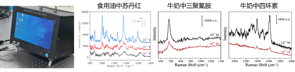 光纤作为一种优良的光波导,具有传输损耗低、抗干扰能力强等优点。通过将光纤SERS探针插入待测溶液中即可实现液相SERS光谱的原位检测。我们研制了光纤探针增强型便携式拉曼光谱仪,并基于此实现食用油中非法添加物、牛奶中三聚氰胺、牛奶中四环素等多种复杂液相体系的SERS光谱检测。