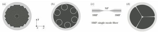 微纳结构光纤通常由单一材料(石英)制成,包含沿光纤轴向延伸的空气通道。图7为几种可作为气体或液体样品池的微纳结构光纤,分别是光子带隙空芯光纤(PBG-HCF)、反谐振空芯光纤(AR-HCF)、微纳光纤(NF)及悬挂芯光纤(SCF)。这些光纤的导光机理有所不同,但共同点是大部分的光模场能量局限在空气纤芯中或微纳纤芯表面附近的空气中,可实现光和样品的高效相互作用。