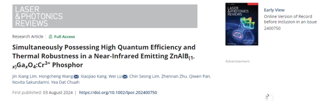 近日,yl88858永利集团王红成教授团队研发了一种同时兼具高量子效率和超高热稳定性的近红外发光材料。该研究在《Laser & Photonics Reviews》(影响因子:9.8,中科院1区TOP期刊)上发表题为“Simultaneously Possessing High Quantum Efficiency and Thermal Robustness in a Near-Infrared Emitting ZnAlB(1-x)GaxO4:Cr3+ Phosphor”的研究论文。这篇论文的第一作者林金祥是我校与诺丁汉大学马来西亚校区的联合培养博士生,我院光电材料团队吕伟副研究员和王红成教授为通讯作者。