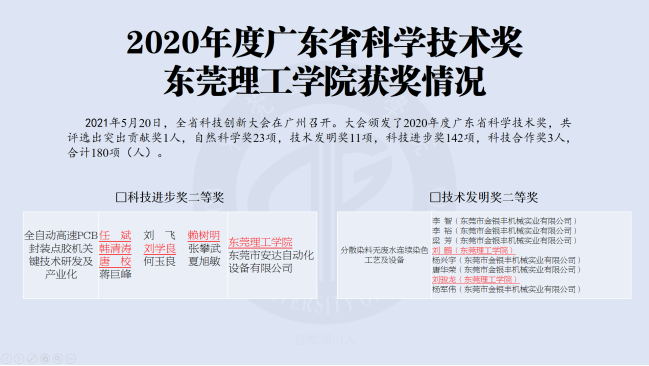 2021年5月20日,全省科技创新大会在广州召开,大会颁发了2020年度广东省科学技术奖。其中,电子工程与智能化学院任斌教授负责的团队项目——由永利集团和东莞市安达自动化设备有限公司完成的“全自动高速PCB封装点胶机关键技术研发及产业化”荣获广东省科学技术奖科技进步奖二等奖,电智学院赖树明高级工程师、韩清涛副教授、刘学良副教授、唐校博士参与该项目。