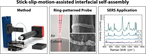 最近,为了进一步提升光纤SERS探针的检测灵敏度,针对具有更大相互作用面积的锥形光纤结构,团队在实验上发现了一种新颖的激光诱导下锥形光纤与纳米颗粒溶胶间形成的弯液面的粘滑运动,并基于此发展了“粘滑运动辅助的界面自组装法”,成功在光纤锥面制备出纳米颗粒环状分布的光纤SERS探针(如图2所示)。得益于每个纳米颗粒环中包含的数量众多的纳米颗粒团簇结构提供的大SERS增强因子,以及探针的SERS整体激发与积分收集效应,该类锥形光纤SERS探针展现出高的液相原位检测灵敏度(结晶紫溶液:2.0 × 10-10 M,孔雀石绿溶液:1.0×10-9 M,福美双溶液:1.0×10-9 M)和优良的光谱检测重复性RSD <6%),从而在生物医药、食品安全、环境检测等领域的液相原位光谱检测应用中具有重要应用前景。