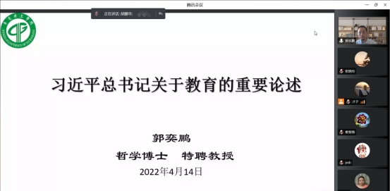 为深入贯彻落实教育教学大讨论活动落到实处,4月14日,电子工程与智能化学院党委邀请马克思主义学院党委副书记、特聘教授郭奕鹏为我院全体教师作“习近平总书记关于教育的重要论述”的专题讲座。会议由学院党委书记、执行院长胡耀华主持,以线上会议的形式开展。