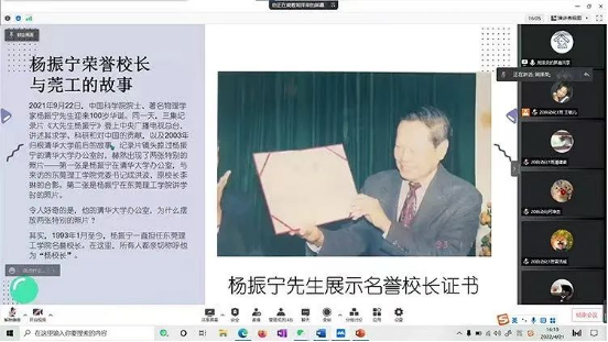 1933年1月至今,杨振宁先生一直担任我校的名誉校长。在本次班会上,同学们回顾了解了荣誉校长杨振宁先生的成就,以及杨振宁与莞工的故事。杨振宁先生在28年间4次赠墨宝,题写“学而知不足”的校训勉励莞工人;6次莅临学校指导,与莞工师生分享学习和科研的心得快乐;在莞工校园内亲手栽植3株名木;先后在学校设立杨振宁奖学金、杨振宁教研楼、杨振宁创新班;这些都是杨振宁先生寄予莞工学子的厚望,也将是伴随莞工开创下一个十年的美好祝愿。同学们纷纷表示通过班会提高了自己对母校的认同感、自豪感,希望早日返校到杨振宁楼参观学习,近距离地了解和学习莞工历史。