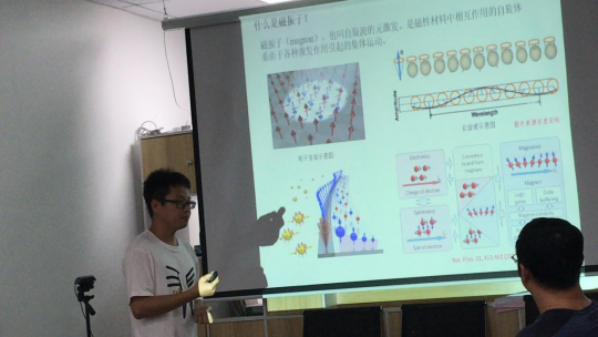 首先由去年国家自然科学基金青年基金项目获得者刘增星讲师为大家分享了近期研究工作进展,作了题为《磁振子耦合系统中的相关非线性效应研究》的报告。他首先简要介绍了何为磁振子(magnon),并指出磁振子在后摩尔时代光电子器件的发展中作为信息载体在未来的通信技术有着广阔的应用前景。此外,报告人还展示了目前国际国内上有关磁振子的研究在自旋电子学和未来器件领域的一些重要进展,并结合自己的相关工作,分享了他在磁振子耦合系统中的相关理论研究及其应用。