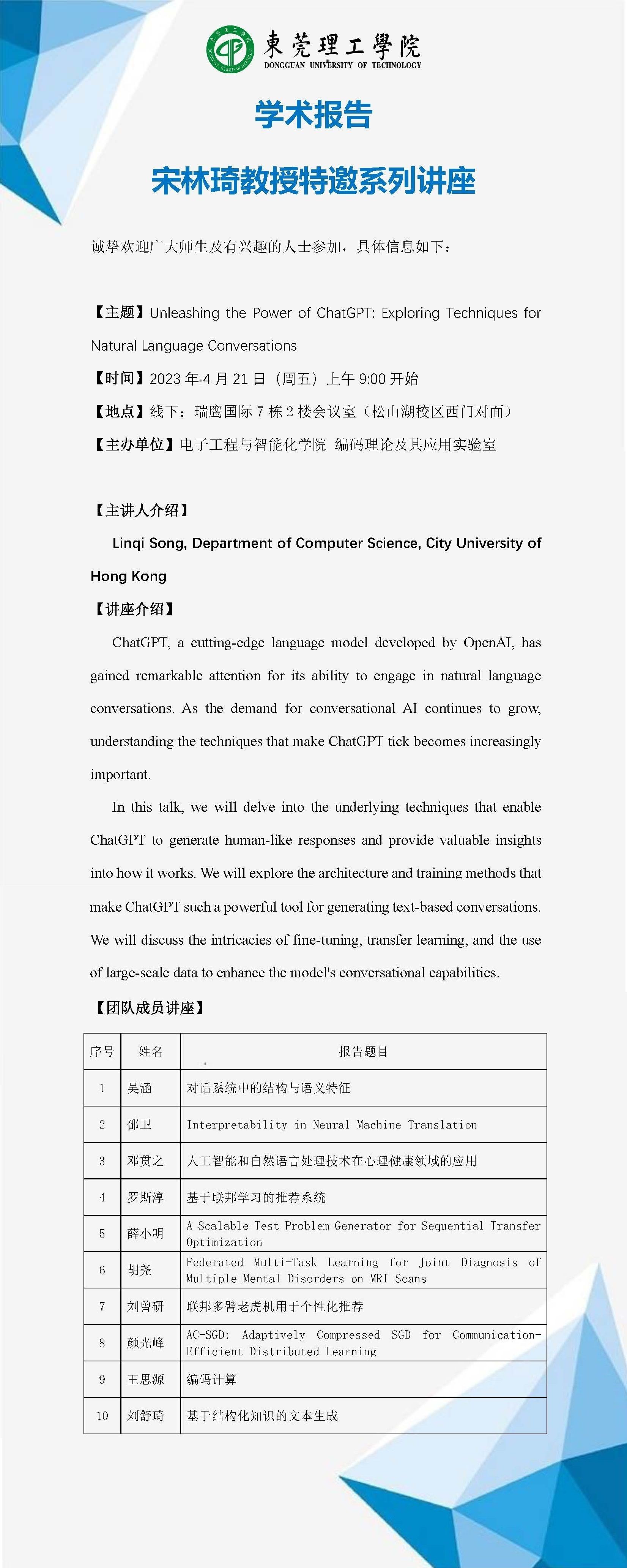 学术活动预告:宋林琦教授特邀讲座(4月21日)