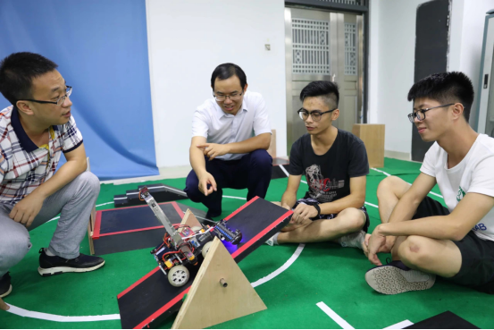 每当寒暑假来临时,任斌也没有享受着教师的长假待遇,而是选择了和学生一起做研究,带领学生参加各种比赛。关于备赛与比赛,提起自己印象深刻的事情,任斌十分感慨。在2018年ROBOCON南方赛场比赛的前一天的调试中发生超声波定位一直不稳定的事情,任斌带领学生当晚一遍遍地调整,没有想过放弃,一直坚持到闭馆,第二天又早早地来到备馆,争分夺秒地调试,修改程序。这种临危不乱,发现问题并马上解决问题的精神让人动容。备赛过程中需要学生快速运用电子信息、程序编程、机械结构等的相关知识,进行及时调整。“往往一场比赛下来后,参赛者对于该领域的专业知识熟悉程度就超过了其他高年级同学,这就是实践的重要作用。”任斌强调道。