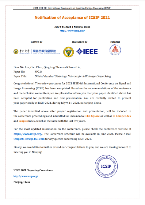 近日,我院大三本科生林涅以第一作者身份在国际科研学术会议 IEEE 6th International Conference on Signal and Image Processing (ICSIP)投稿学术研究论文并被成功录用。论文指导教师为我院陈高老师、刘婵梓老师及周清峰教授,其中陈高老师为论文通讯作者。论文题目为Dilated Residual Shrinkage Network for SAR Image Despeckling